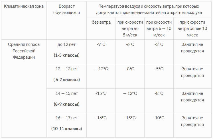 по проведению занятий физической культурой, в зависимости от температуры и скорости ветра в некоторых климатических зонах Российской Федерации на открытом воздухе в зимний период года
