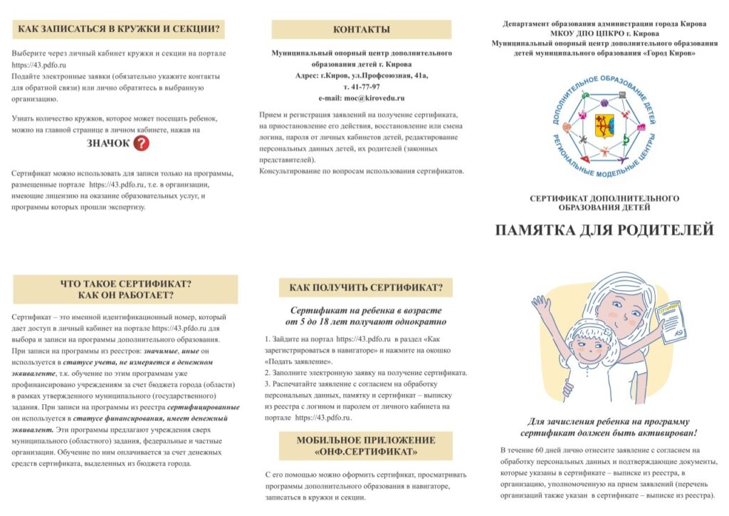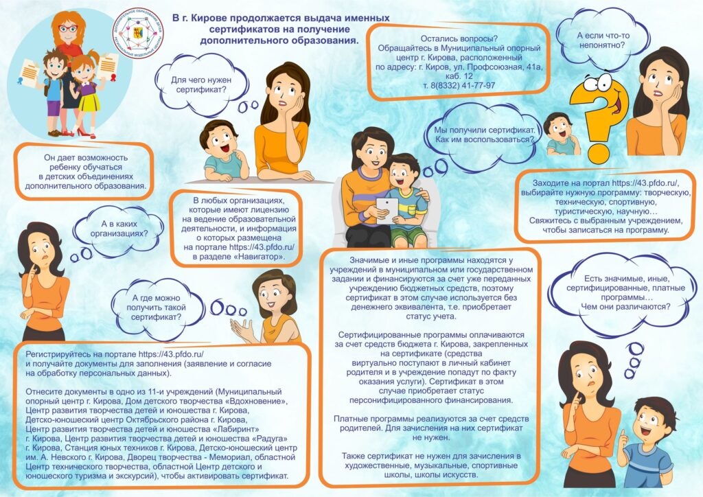 Сертификат дополнительного образования – это именной идентификационный номер, дающий детям право получения дополнительного образования.В городе Кирове право на получение сертификата имею дети в возрасте от 5 до 18 лет, прописанные (проживающие) на территории города или обучающиеся в учреждениях города.
